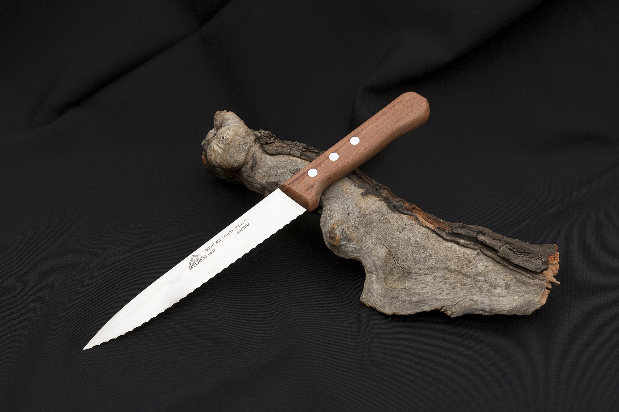 The Stubai kitchen knife is versatile and ideal for everyday use, especially in situations where a large chef’s knife is too big or cumbersome. With its narrower blade up to 3 cm wide, it is well suited for cutting fruits and vegetables, meat, sausage, and cheese. Stubai uses a special hardening technology to ensure sharpness and durability even under demanding conditions. The ergonomic, non-slip handle is made of wood. This knife combines quality, practicality, and reliability—perfect for any kitchen.